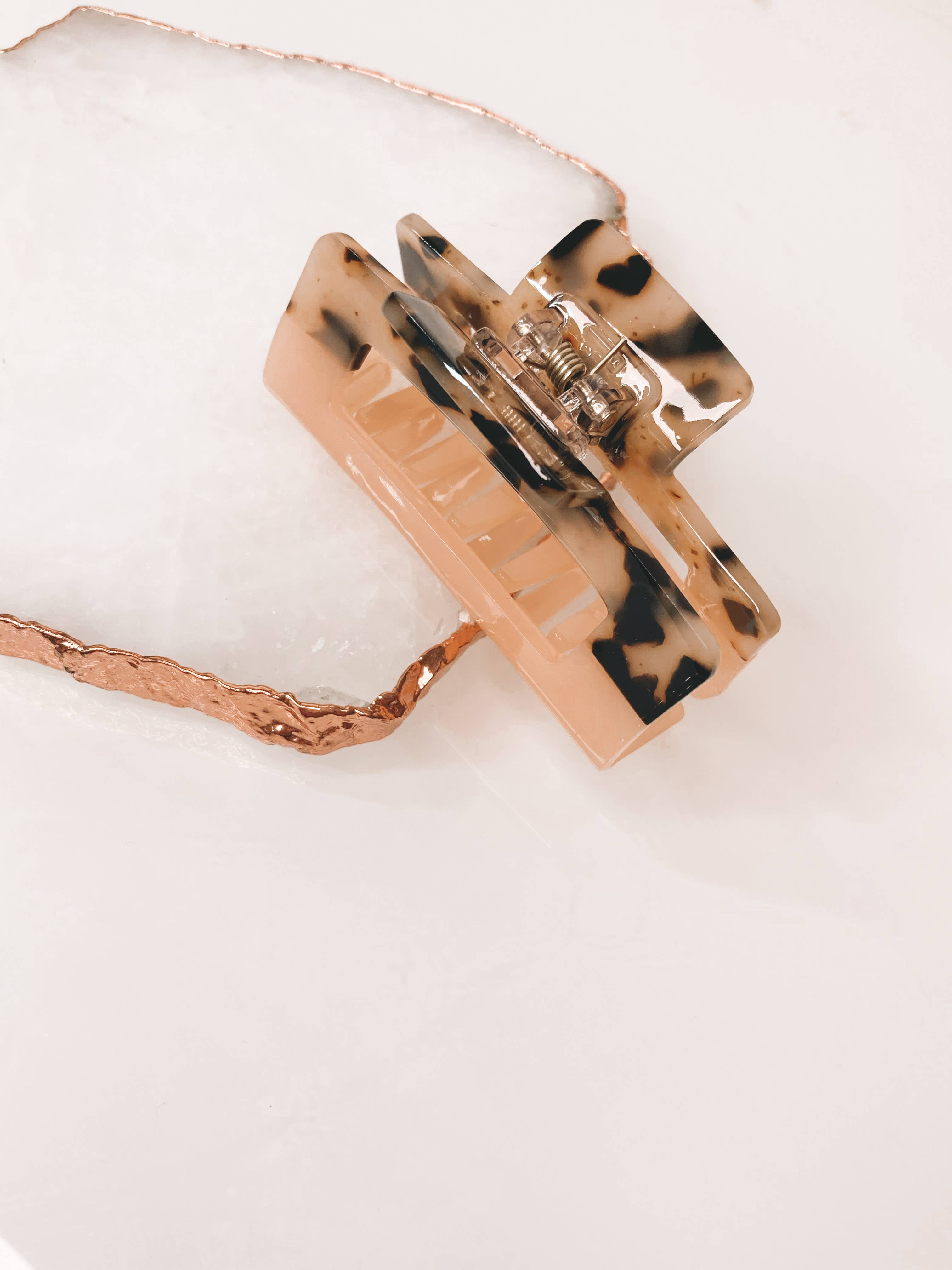 Light Tortoise and Peach Block design. Made of 100% cellulose acetate - an easily biodegradable eco conscious material that will fully break down. Medium Size Rectangle Claw Clip. 7cm Size. Recyclable. Sturdy and well made, will hold fine to thick hair easily. These hottest trending hair accessories are always hot sellers in shops!